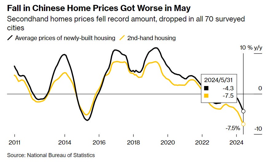Excess housing supply amid extremely weak home buying demand has caused house prices in China to continue falling deeper: