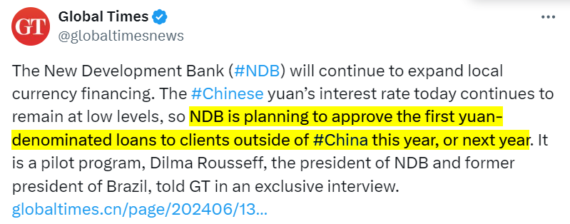 New Development Bank - the development bank of the BRICS bloc has announced it will issue bonds/debt in CNY for international investors!