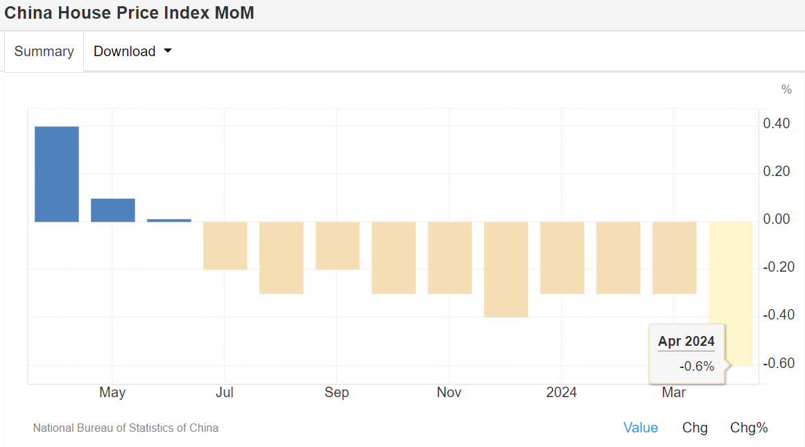 China's house price index fell -0.6% m/m in April (the largest drop since 2014)