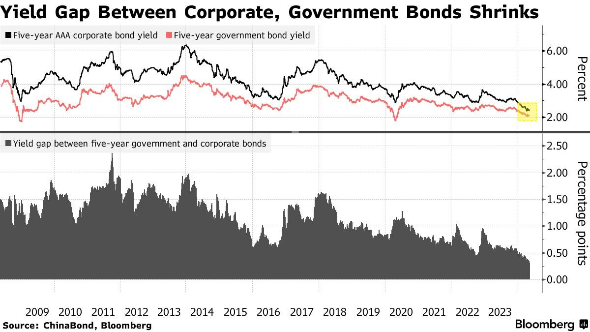 => causing corporate bond yields (which are riskier) to drop nearly equal to government bond yields (safer assets).