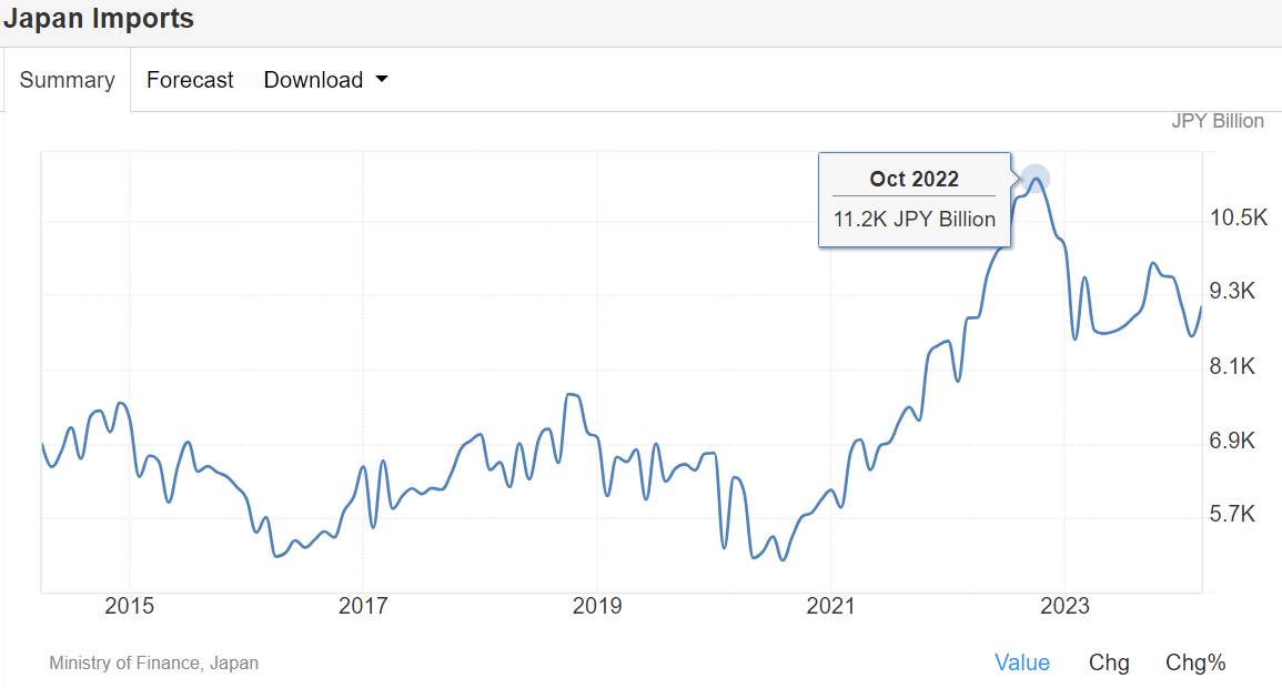 It is no coincidence that the value of imports into Japan peaked right at the time of October 2022 when the Yen plummeted and inflation was on the rise.