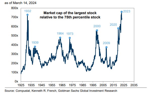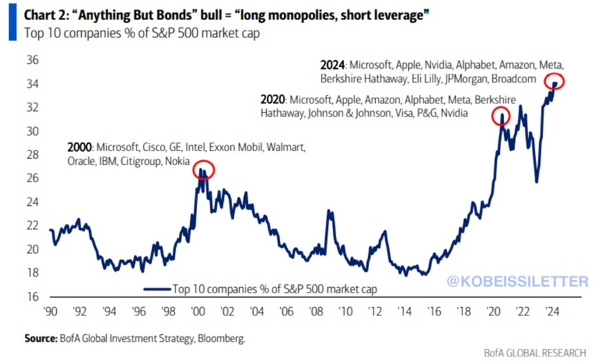 Top 10 companies in S&P500 contribute up to ~35% of total market cap - the highest ratio in over 50 years.
