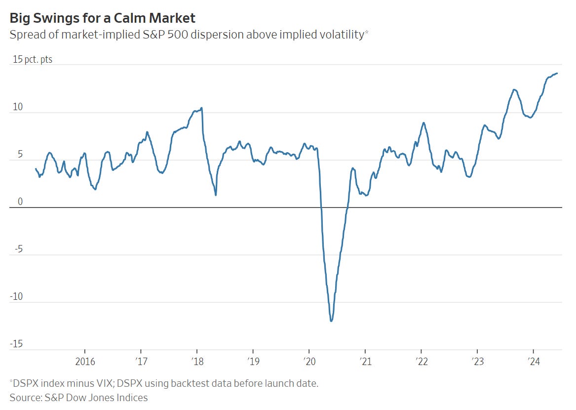 Although S&P 500 appears stable, the index measuring VIX dispersion versus market expectations for SPX (= DSPX - VIX index) is rising to unprecedented highs (since data tracking began in 2014).