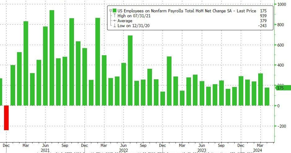 April NFP report shows lowest job growth in 6 months, +175,000 jobs, nearly half compared to previous month (315,000)