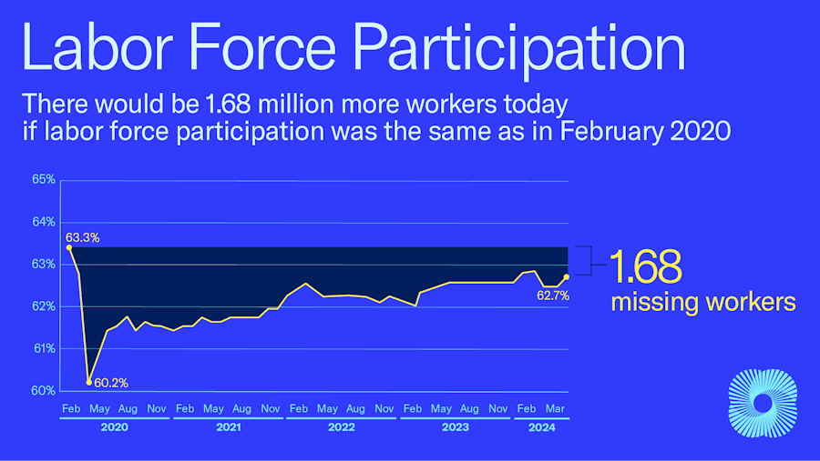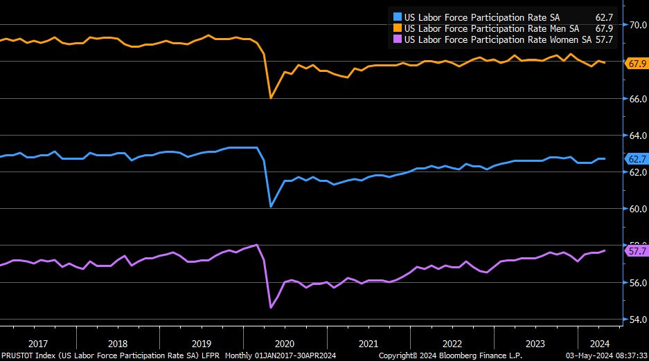 Currently: Labor force participation rate unchanged at 62.7% , women increased to 57.7% - highest since Covid.