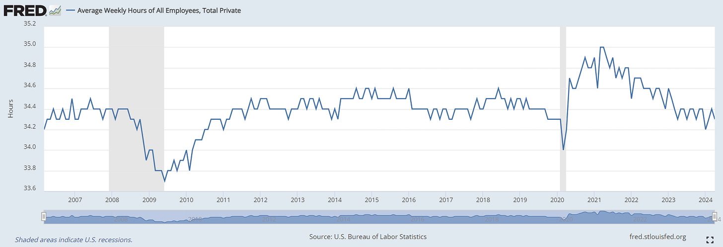 Average weekly hours in April dipped slightly, indicating easing labor demand