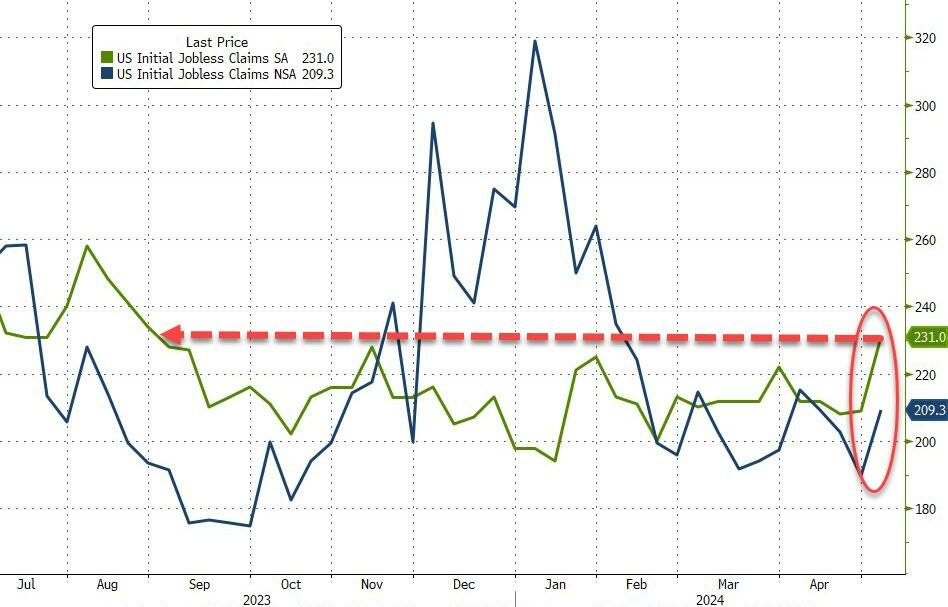 Initial unemployment claims for the week ending 05/05 rose to 231,000 (> forecast 212,000), highest since August.