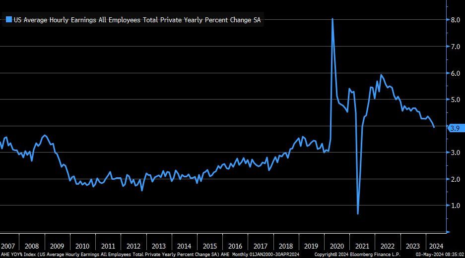 Hourly earnings growth in April at +3.9% YoY (< expected 4% and 4.1% previous month), lowest since June 2021.