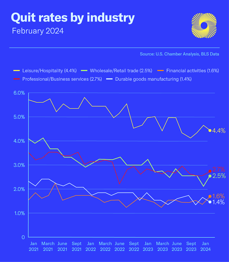 Workers in traditionally lower-paying sectors: entertainment, hospitality, and retail, are most likely to quit.