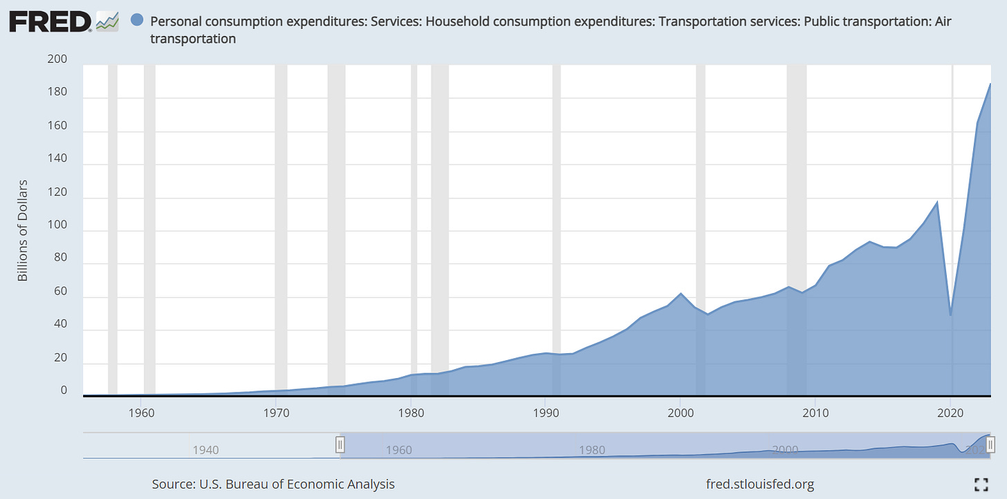 The amount Americans spend on airline tickets (a relative measure of how frequently Americans travel) surged post-Covid: