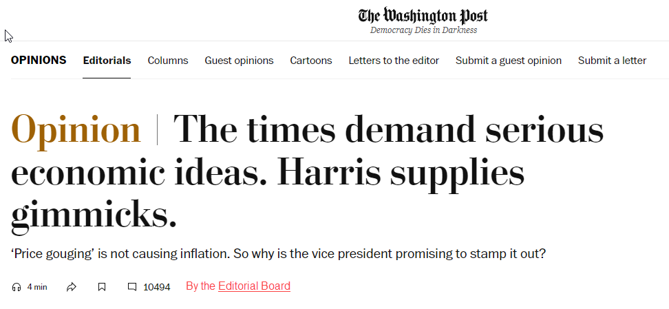 Harris's campaign focuses on blaming businesses for price increases (“price gouging”) causing inflation.
