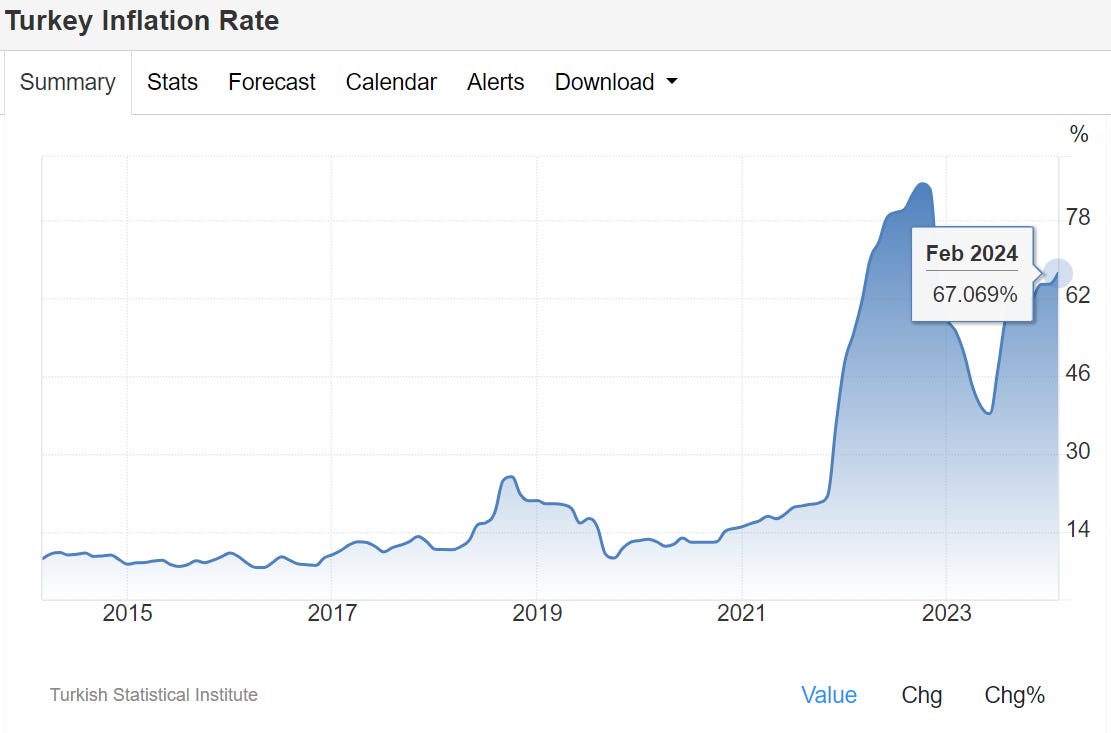 The Lira's depreciation made local currency consumption increasingly expensive for people => inflation spiraled out of control to 67% currently.