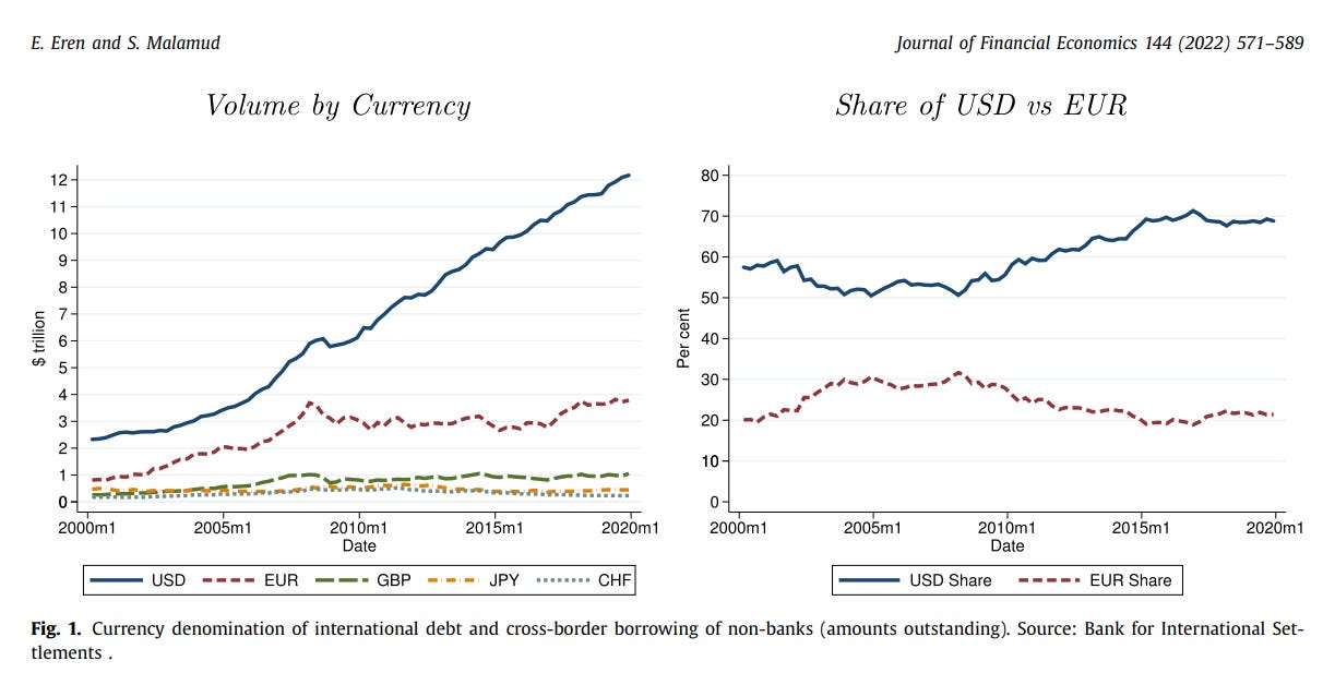 FYI: As of 2020, the 5 main currencies used for borrowing on the international market are still: USD, EUR, GBP, JPY and CHF (Eren and Malamud, 2022).
