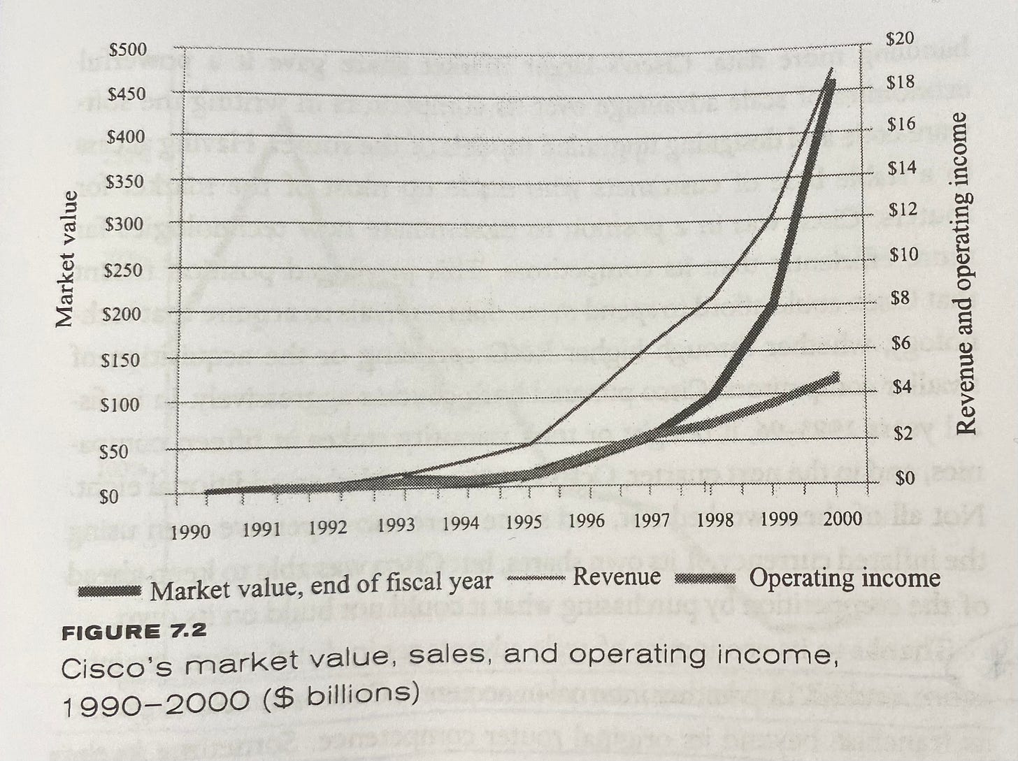 Revenue exploded from $70 million in 1990 to $19 billion in 2000, average growth rate 66%/year.