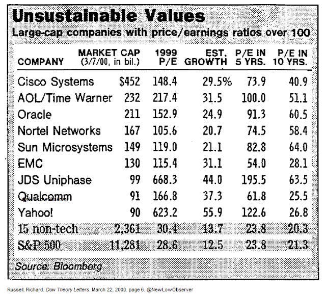 Early 2000, the Dow Theory Letters – a reputable financial publication – published an issue titled “Unsustainable Valuations.”