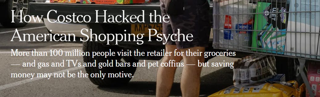 “But Costco's success goes far beyond stockpiling. The company has hacked into the psychology of American consumers, attracting the responsible shopping ego (“12 cans of tuna for 18USD!”) and the impulse buying instinct (“I deserve a 98-inch flat screen”).