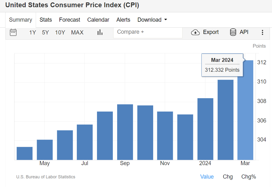 For example: the CPI index for March 2024 is 312.332 points ~ meaning 100 USD in 1982-1984 has the equivalent value of 312.33 USD in March 2024.