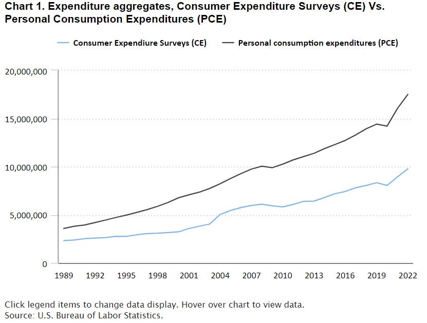 Note: PCE estimates are not taken from a dedicated consumer survey sample like CE (Consumer Expenditure Survey) but based on spending statistics reports from government agencies, administrative agencies, and private organizations/businesses (e.g., trade associations).