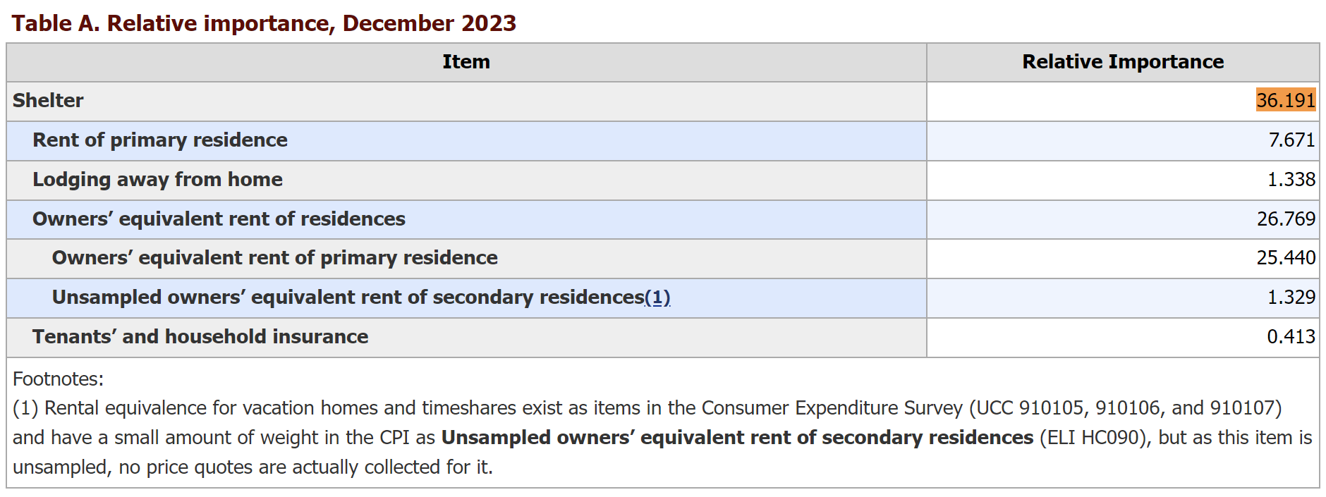 The housing cost category (shelter) accounts for more than 1/3 of the CPI weight as of December 2023.
