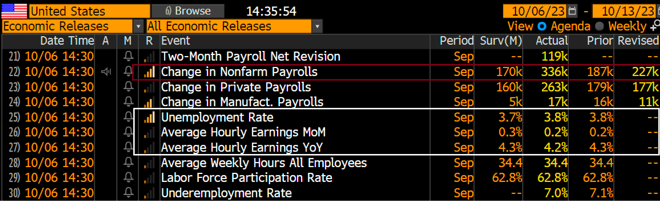 The jobs report shows an addition of +336,000 payrolls in September 2023 - double the forecast (+187,000).