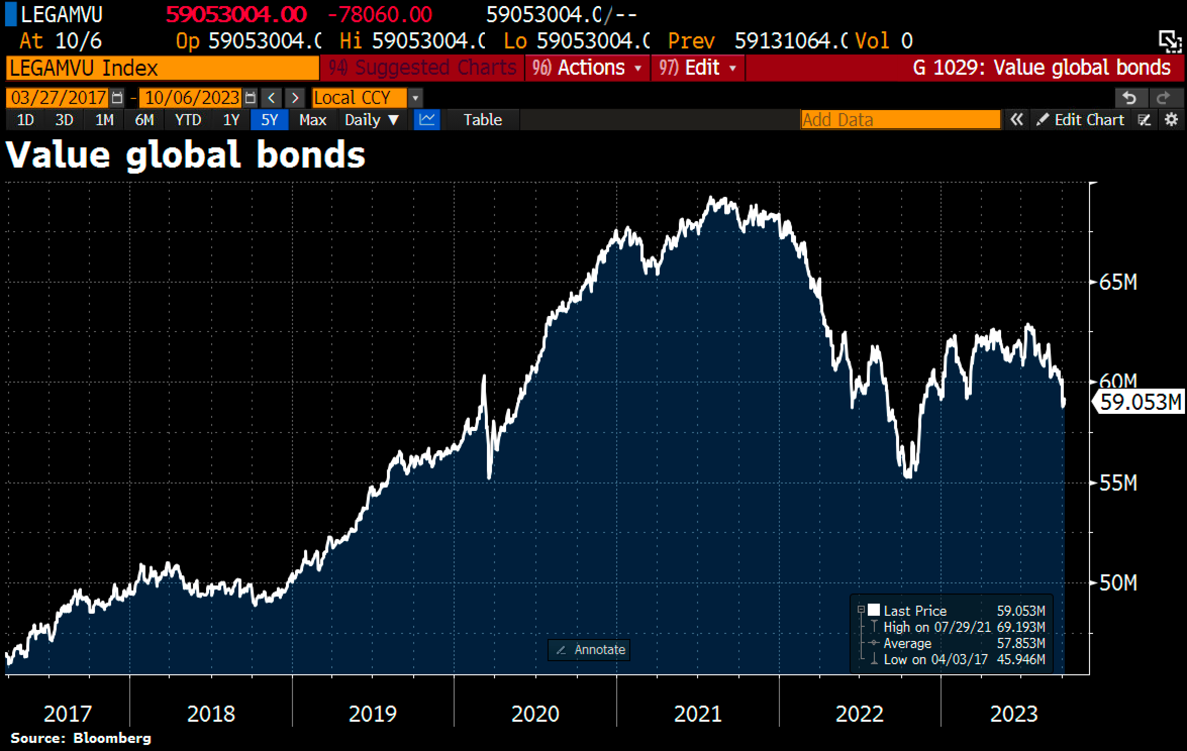 Global bond values have lost an additional -USD 1,040 billion in just the past month, bringing the total bond losses to -USD 3,900 billion since mid-July 2023.