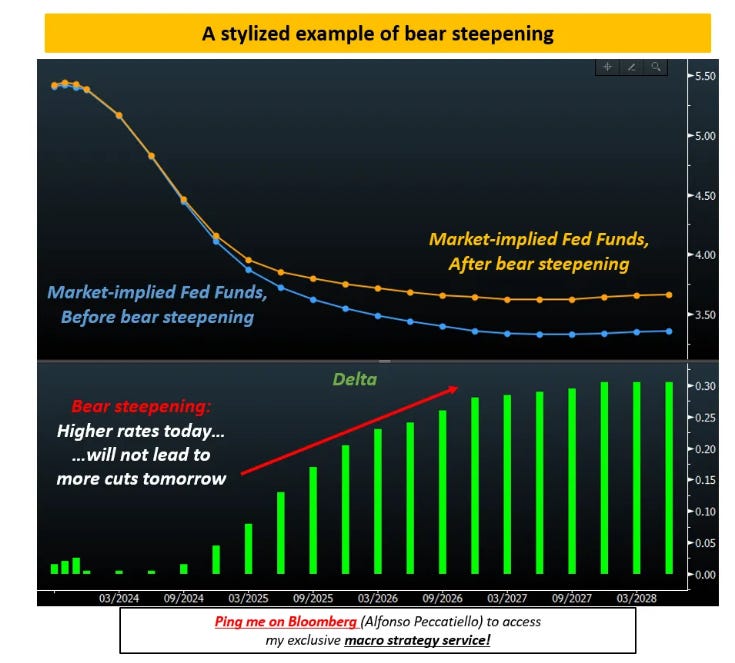 The trend “bear steepening” occurs when interest rates across all bonds rise, but long-term bonds (or those with longer maturities) have a higher rate of interest rate increase (higher delta) - green bar chart below.