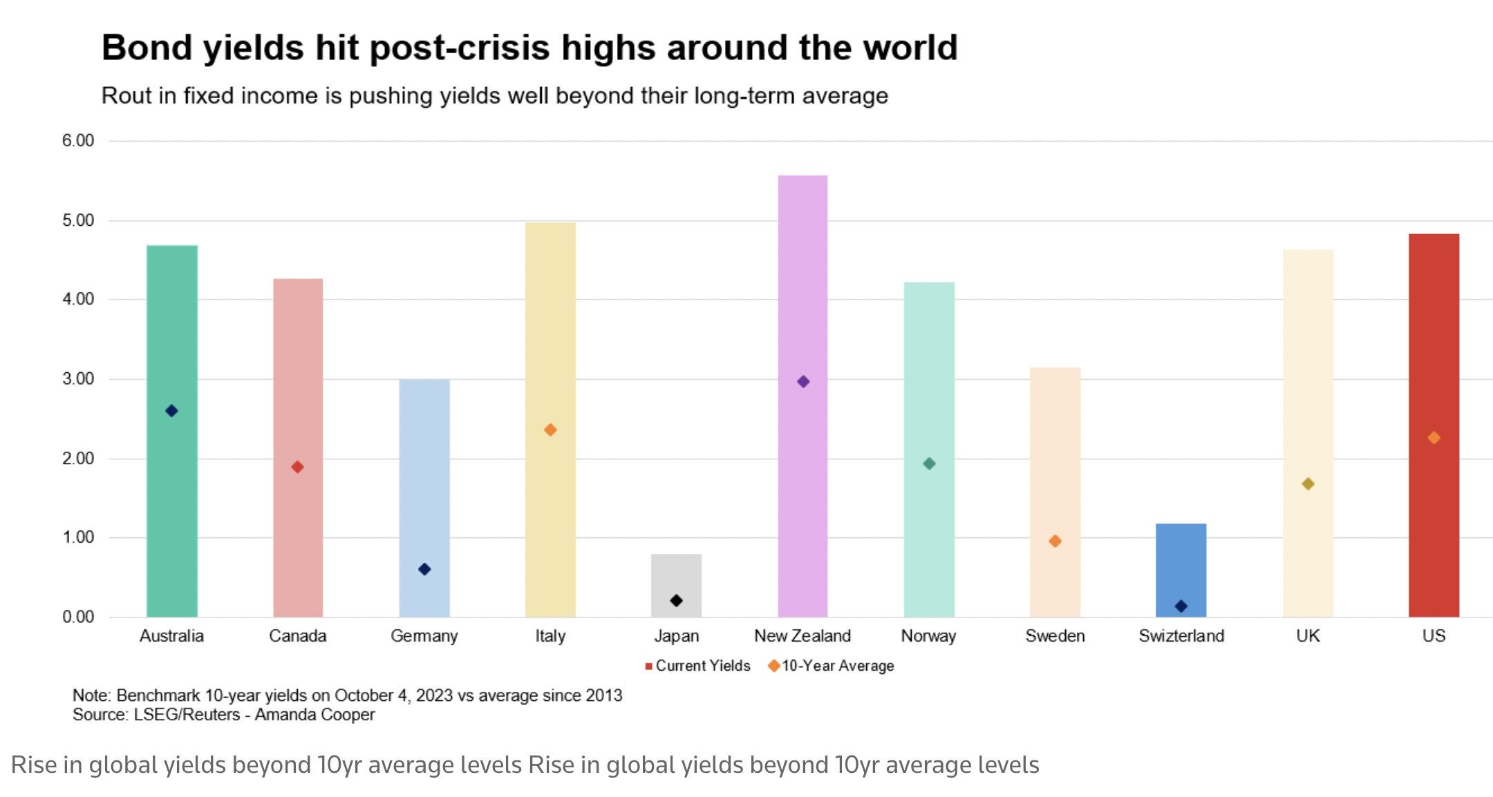 Global bond yields are rising rapidly, now much higher than the average over the past 10 years: