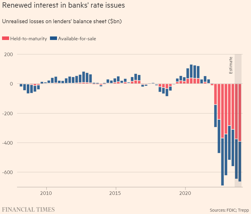 US banks are suffering enormous unrealized losses (one of the causes of the small bank crises from March 2023)