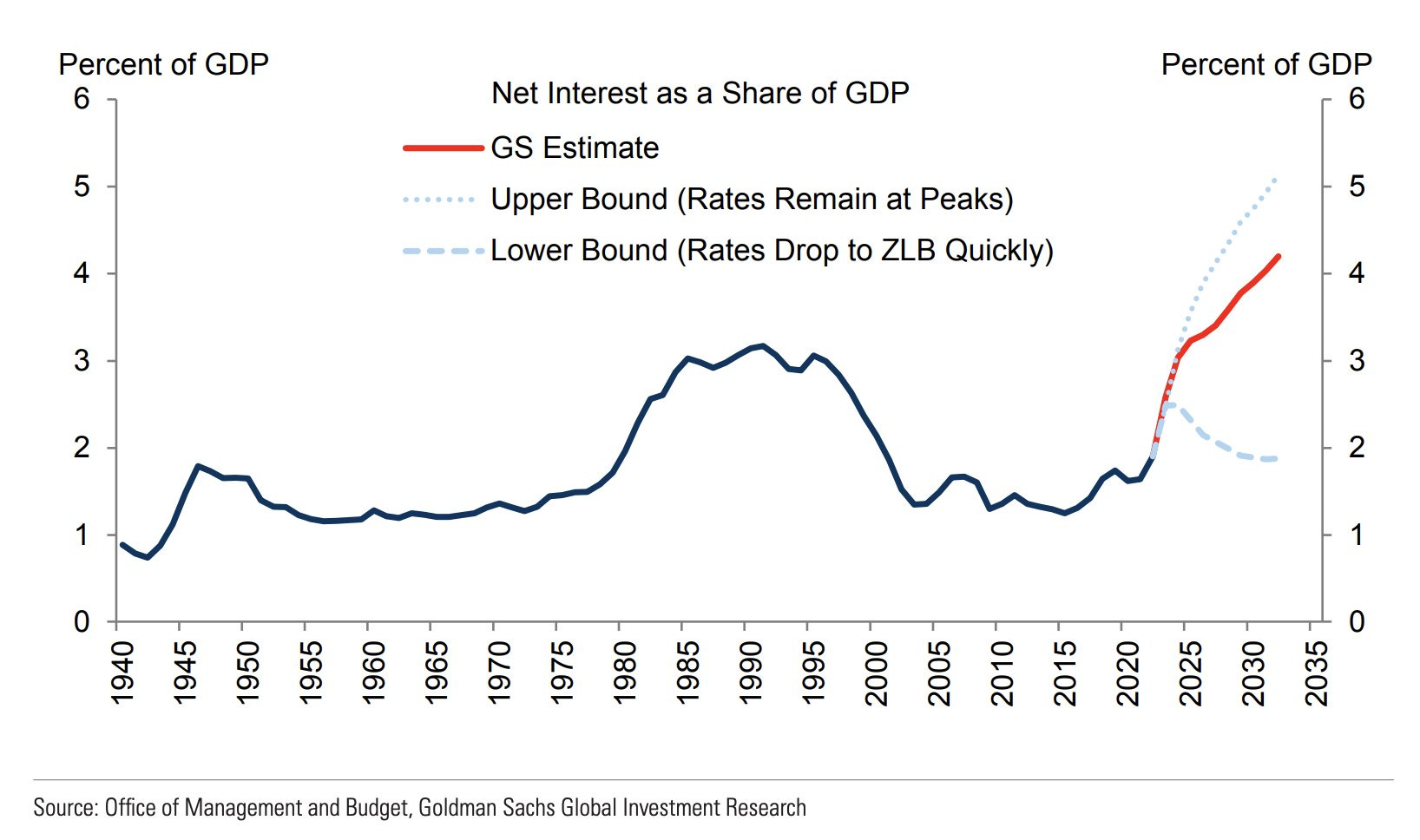 Goldman Sachs estimates that US interest payment costs alone (as %GDP) will continue to rise due to higher borrowing rates: