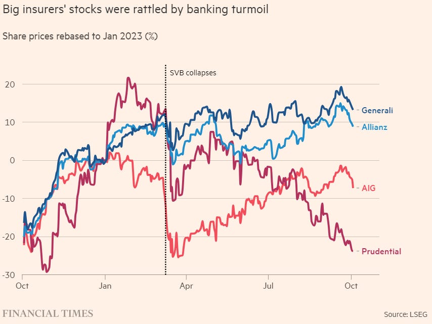 Insurance companies' stock prices fell immediately after the SVB collapse, and are now falling again due to a sell-off wave pushing bond yields higher: