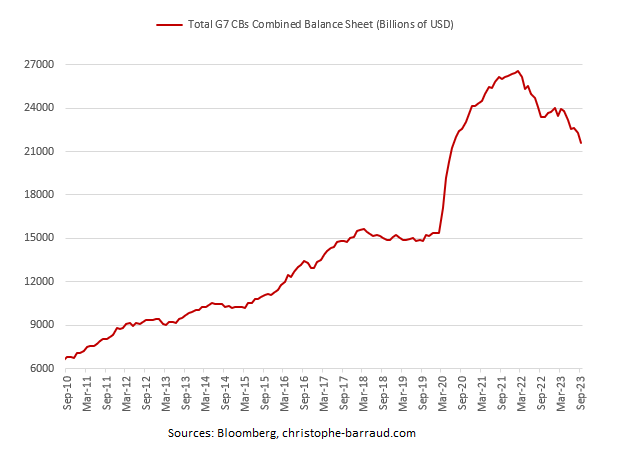 The latest data on the balance sheets of G7 central banks (CBs) continued to decline in September, reaching the lowest level since June 2020.