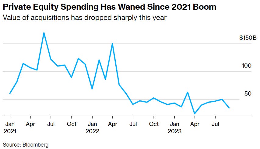 The value of global M&A deals has fallen -45% this year to ~384 billion USD, the second consecutive year of double-digit decline.