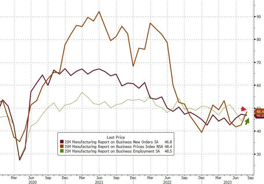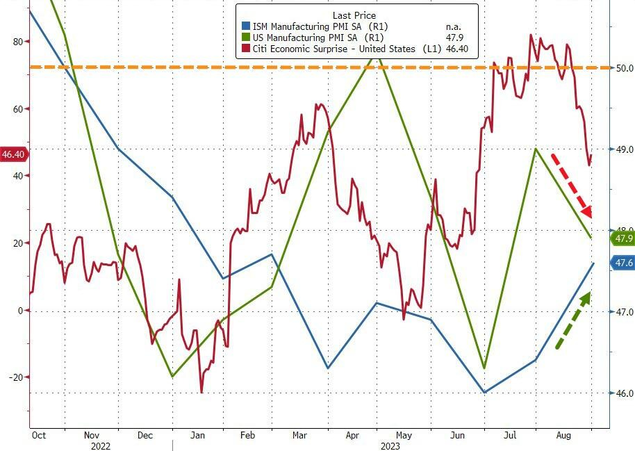 July Manufacturing PMI reached 47.9, down from 49 in June. ISM Manufacturing rose from 46.4 to 47.6 (beating expectations of 47), indicating contraction in the manufacturing sector.