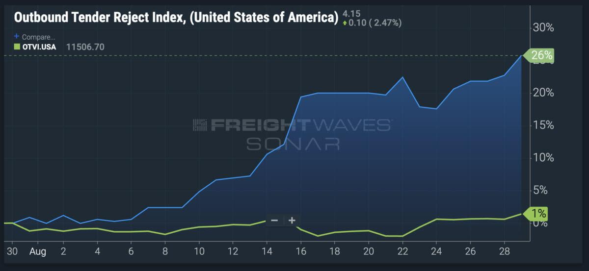 Specifically, over the past 30 days, carrier rejection rates rose to 26%, while order volume only increased 1%. Large and small trucking companies are exiting the industry, meaning fewer trucks to transport goods.