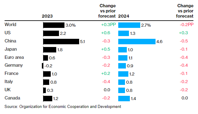 OECD raised global economic growth forecast to 3.0% in 2023 and lowered it to 2.7% in 2024. Inflation expected to continue.