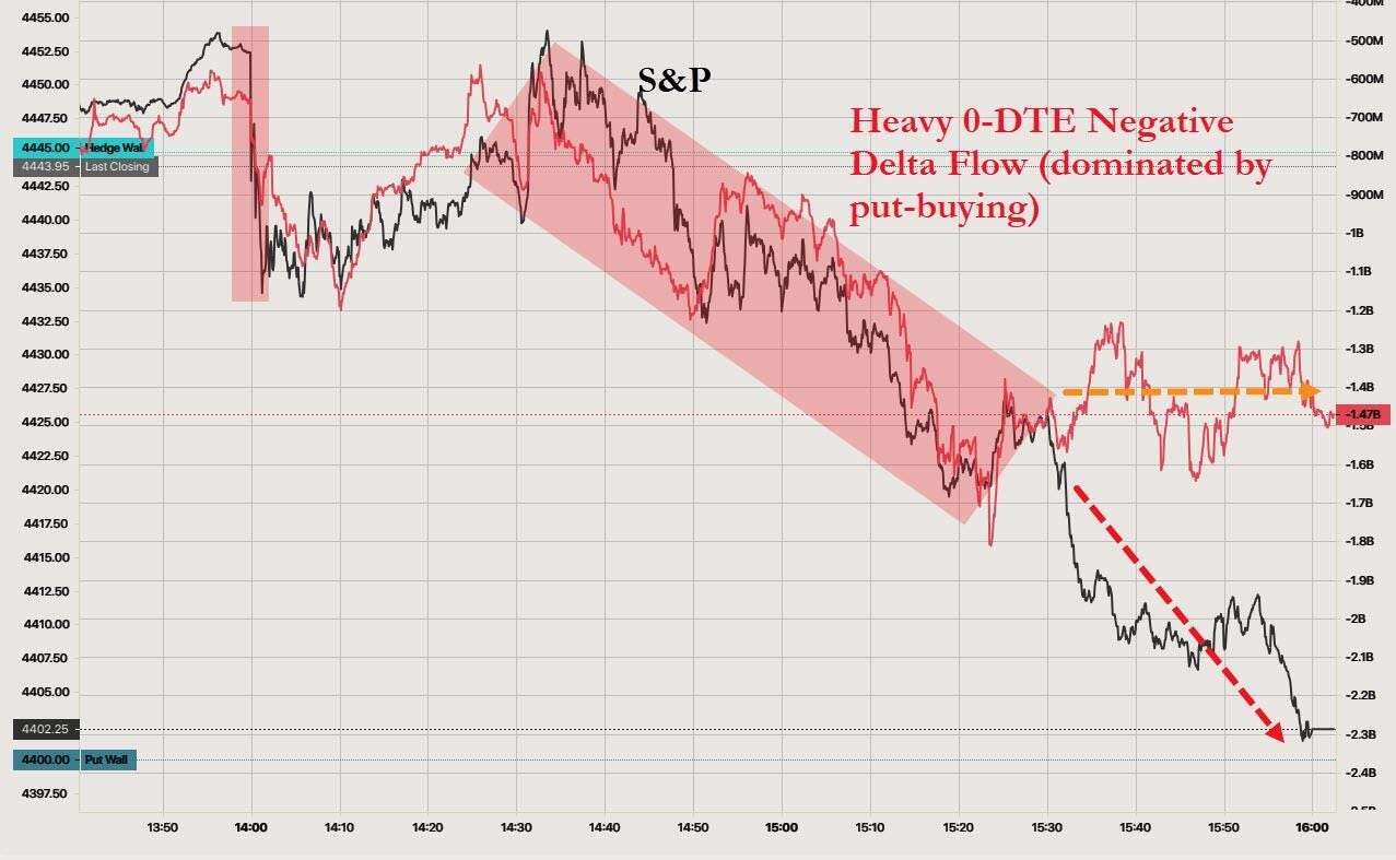 Market reacts sharply after FOMC announces interest rate plans not as expected, SPX hits 4400 after rejection at key gamma level 4500 with panic put buying demand.
