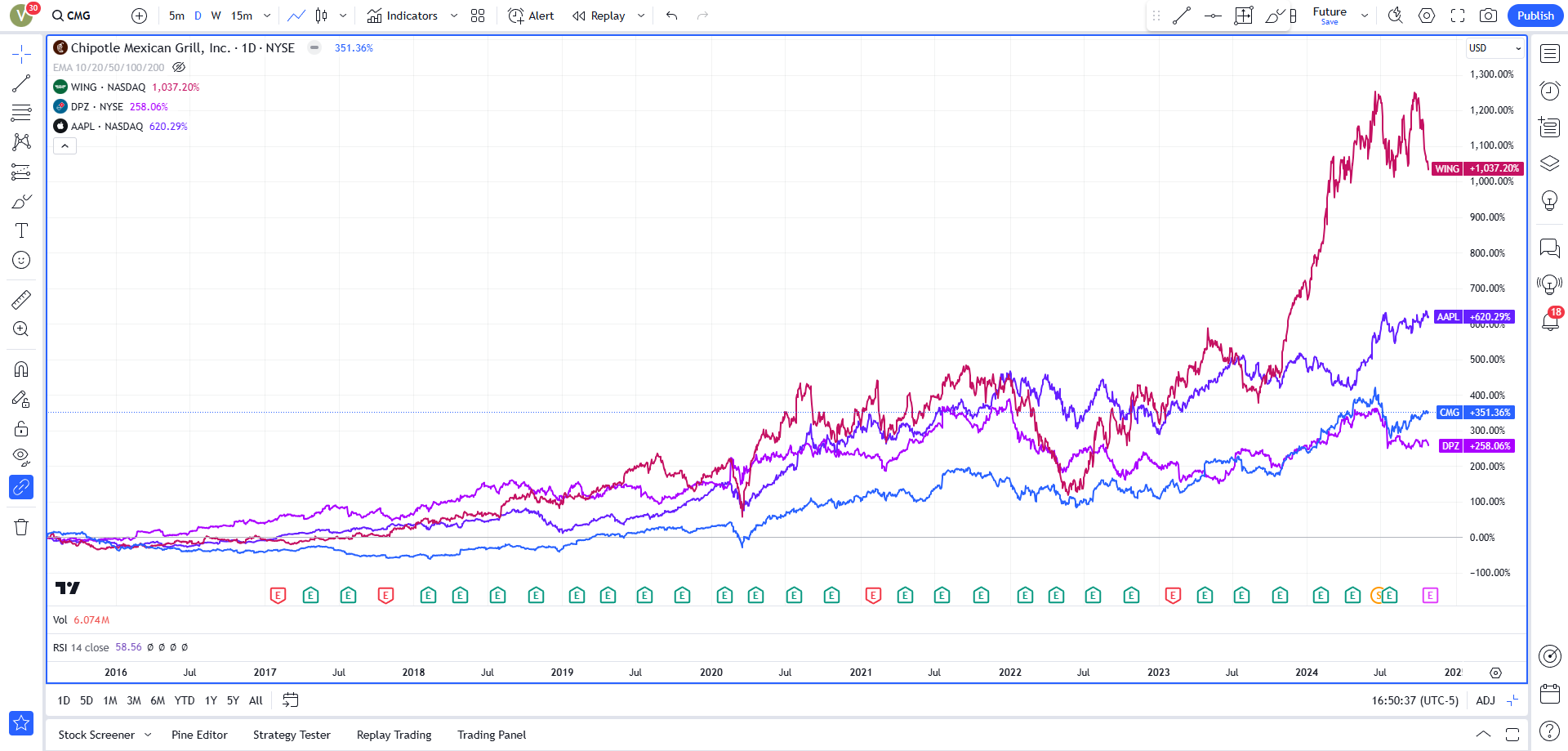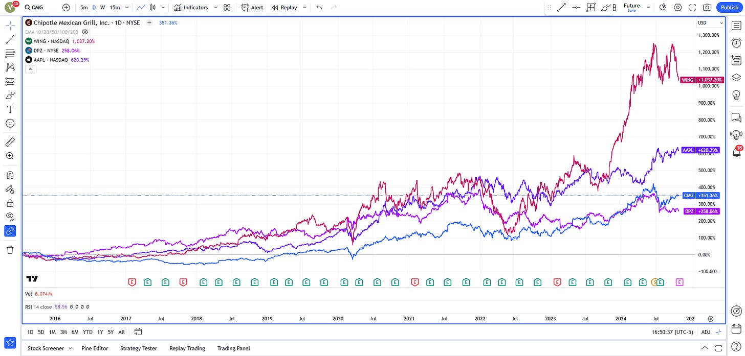 Before diving into the article, Steve wants to highlight a point that few people notice, that it's not only tech stocks that can grow strongly, but businesses can use their strengths to create leverage. For example, comparing 3 food companies with Apple over the past nearly 10 years.