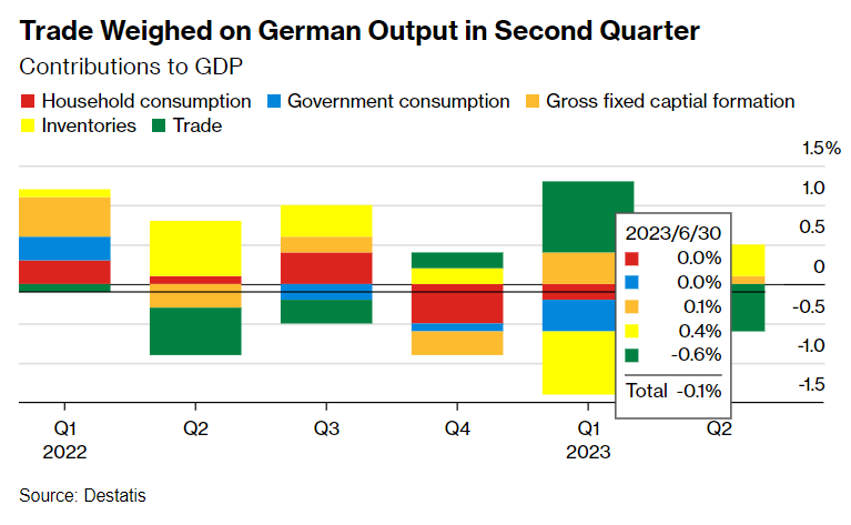 Germany's economy continued to stagnate in Q2/2023, mainly due to exports falling to -1.1% (net exports -0.6%).