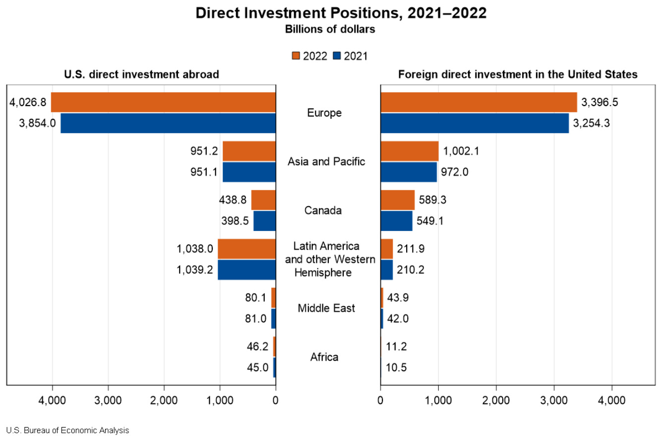 Net direct investment flows (net FDI) from the US to EU are in surplus, meaning capital flows from the US to EU exceed those received by the US from EU.