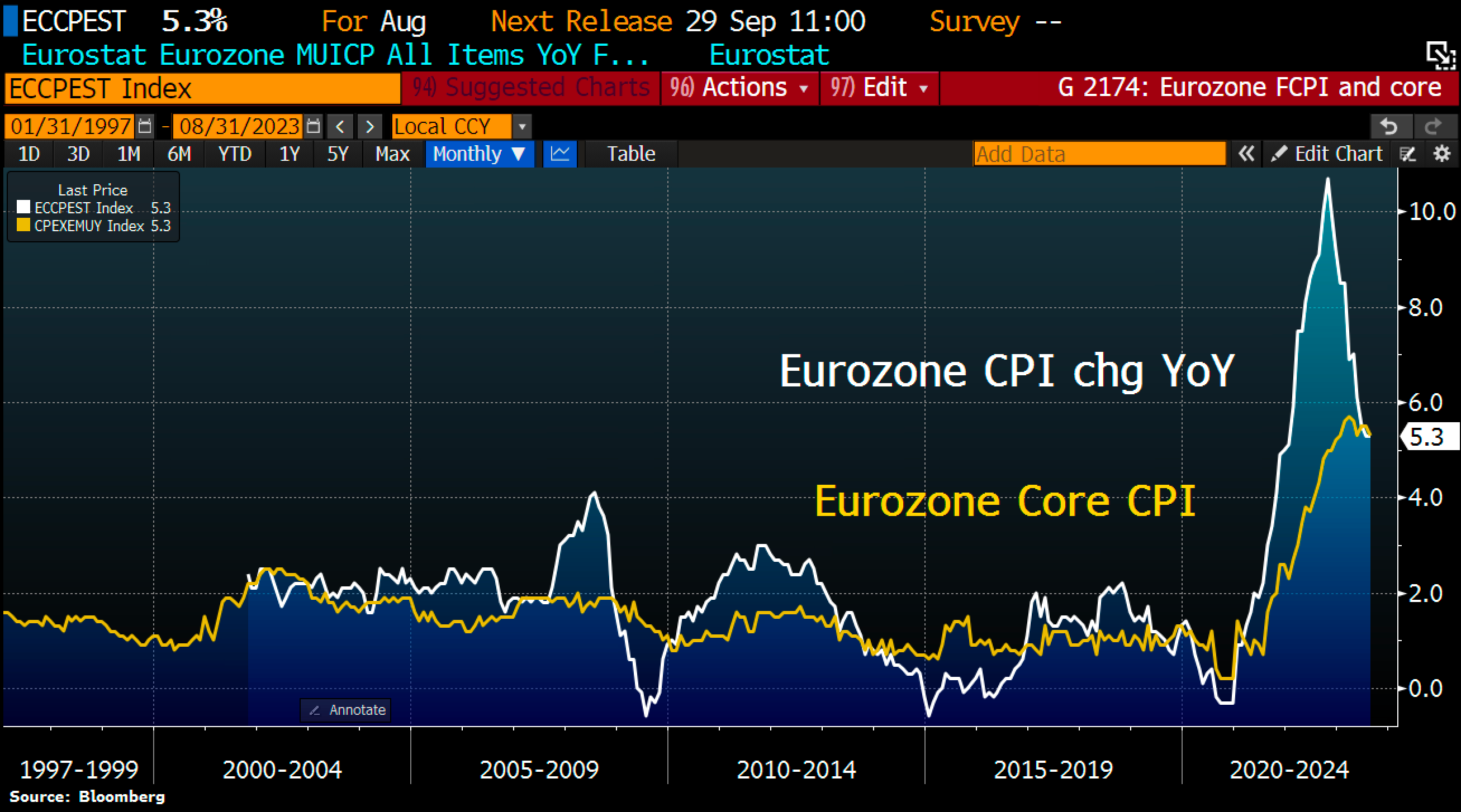 Eurozone inflation remains at +5.3% y/y in August 2023, unchanged from the July figure and higher than the +5.1% forecast for August.
