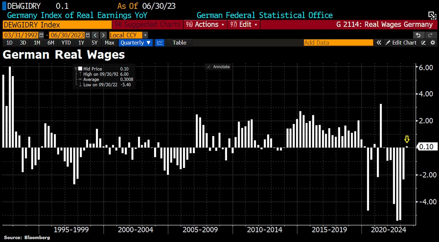 For example in Germany, real wage growth continued to return above 0% in August (nominal wage +6.6% y/y): meaning wages are rising faster than inflation!