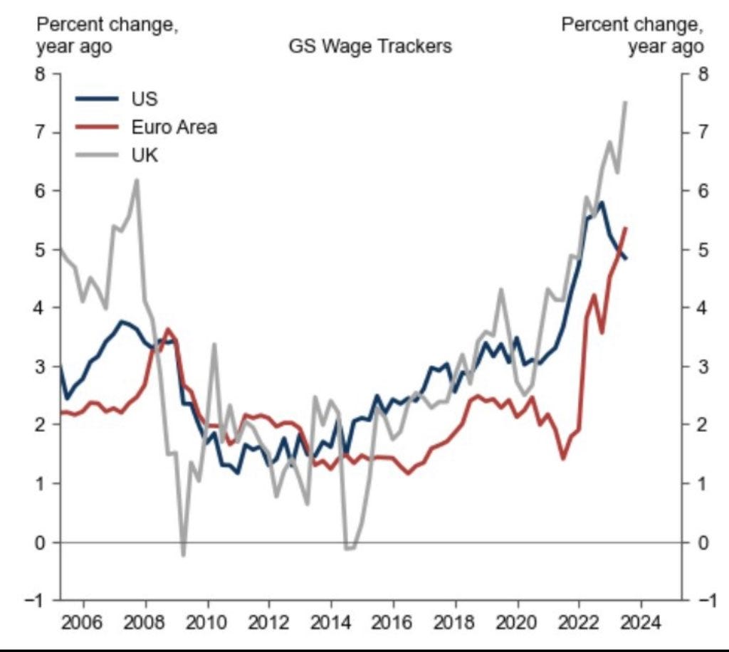Both the US, Eurozone and UK in later stages faced structural inflation issues due to wage-price spiral, where nominal wage growth is too high while labor productivity remains unchanged.
