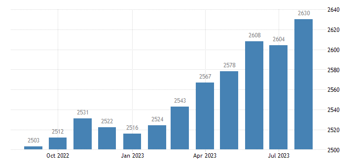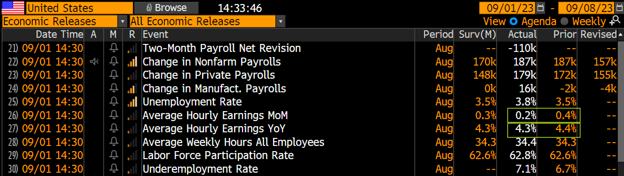 Wage growth has slowed month by month: down from +0.4% m/m in July to +0.2% m/m August 2023.