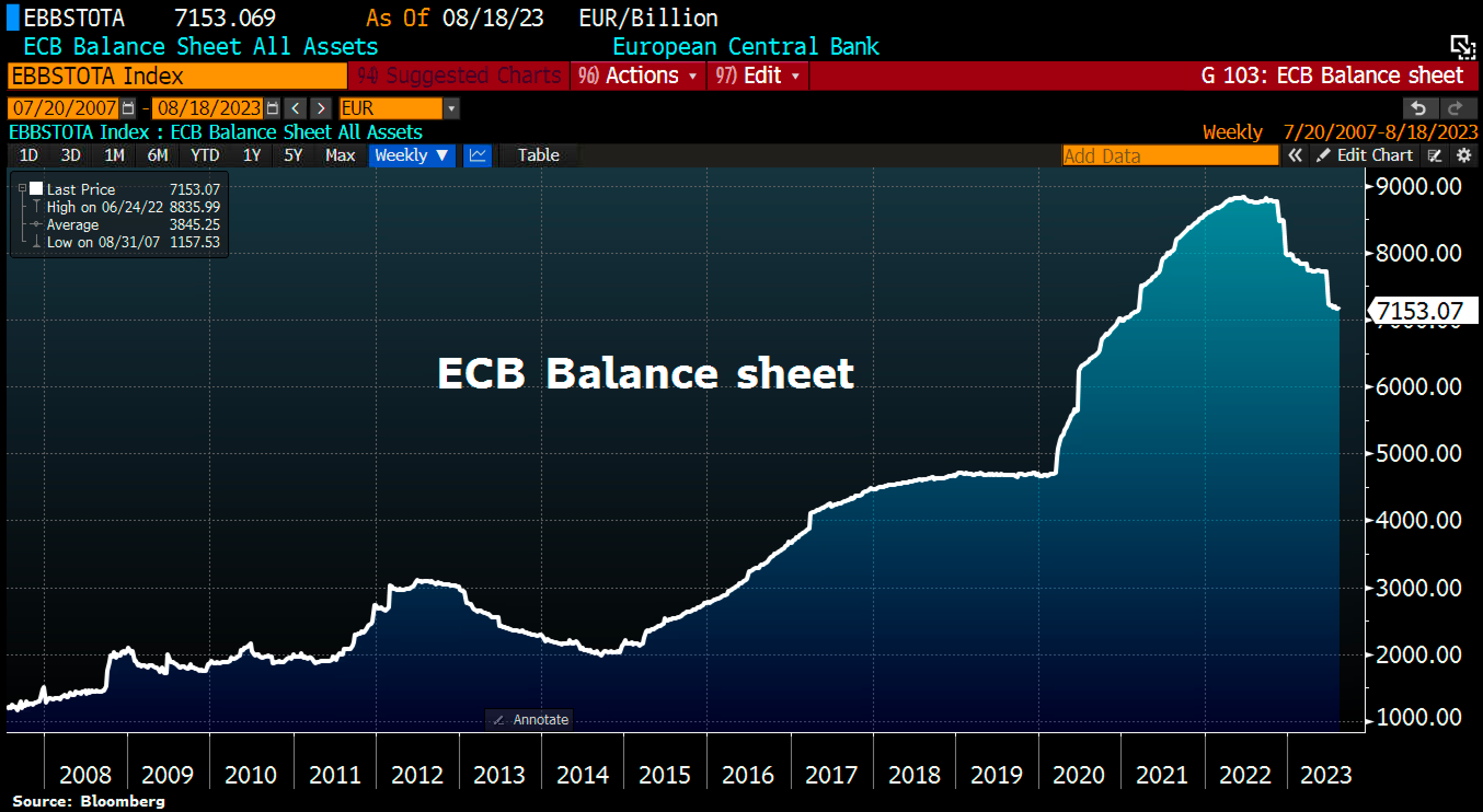 In addition, The ECB continues strong monetary tightening (QT), in which the balance sheet has decreased from EUR 8,835 billion to EUR 7,153 billion in just over a year.