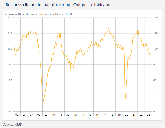 INSEE's business climate index also falls below the 100 threshold, ~ business activities in France are slowing down just like previous EU crisis and recession periods.
