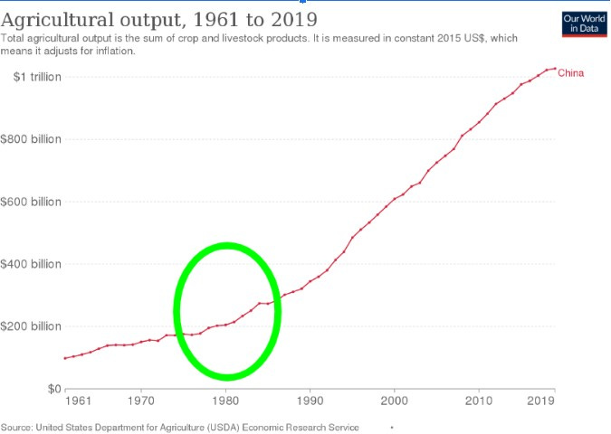 China: land reform from 1978 caused China's food production to escape stagnation and begin to increase sharply.