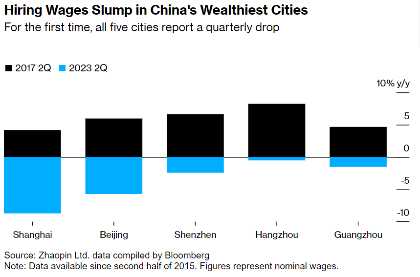 For decades, wages in China's largest cities rose nonstop. But now, recruitment salaries in Shanghai have fallen -9%, in Beijing down -6% yoy in Q2/2023.