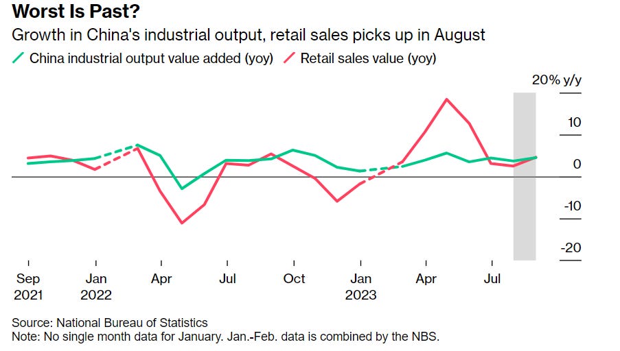 Currently, retail sales and industrial production in China slightly increased in August 2023, good news for the Chinese economy.