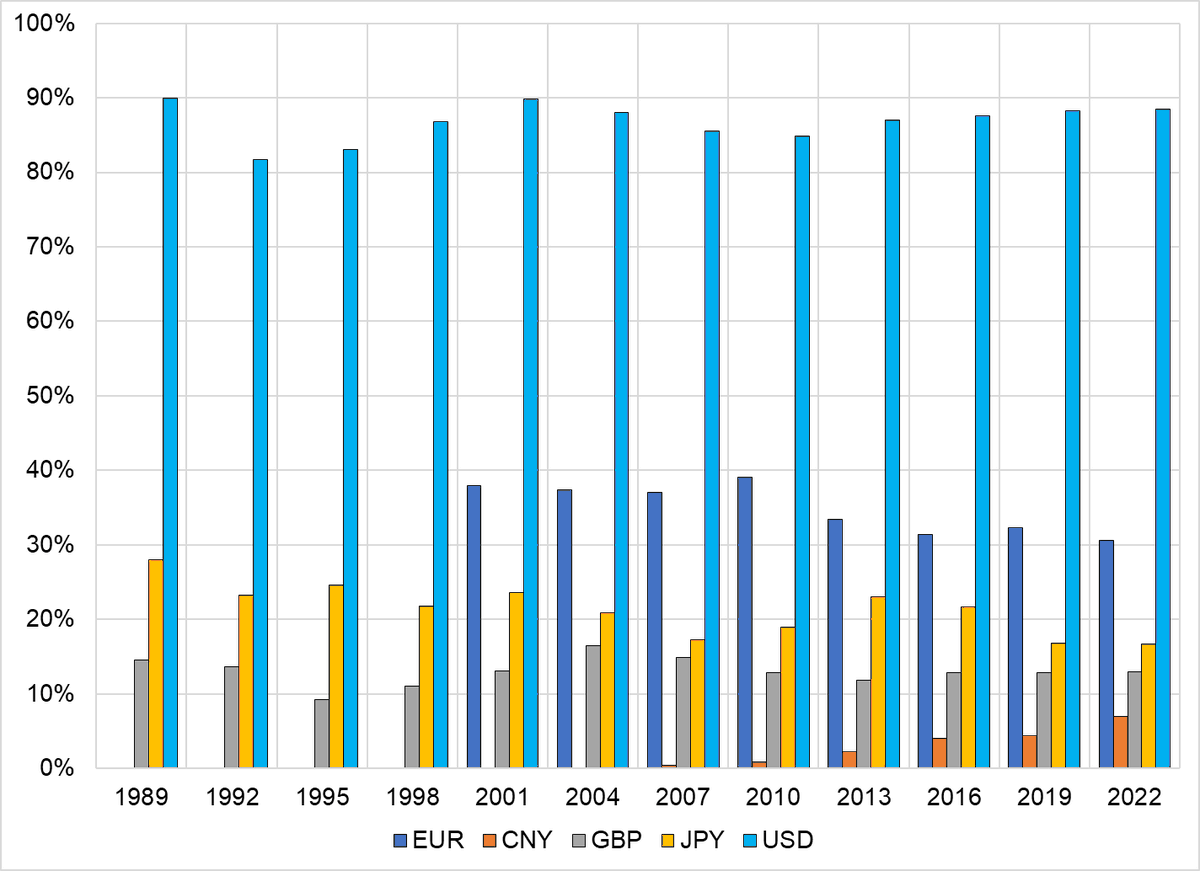 The use of CNY is gradually increasing but as a substitution effect for other currencies (EUR, GBP, and JPY).