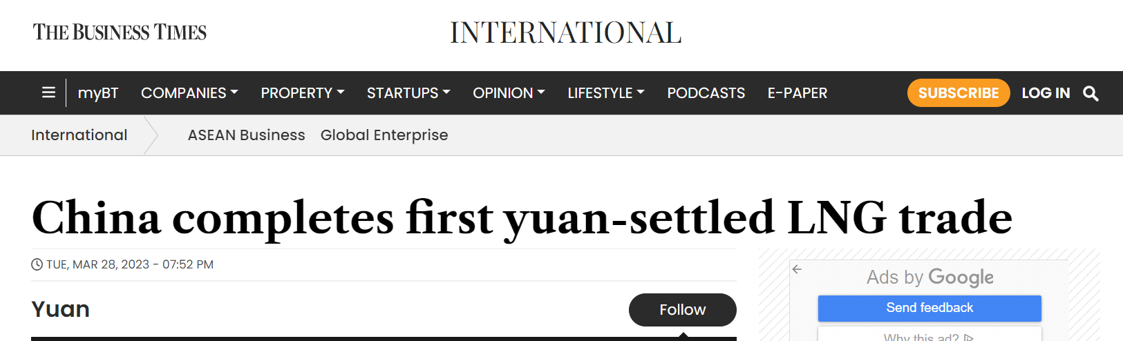 03/28: China completes the transfer of a 65,000-ton LNG (liquefied natural gas) contract with UAE to France's TotalEnergies. The transaction was conducted in CNY.